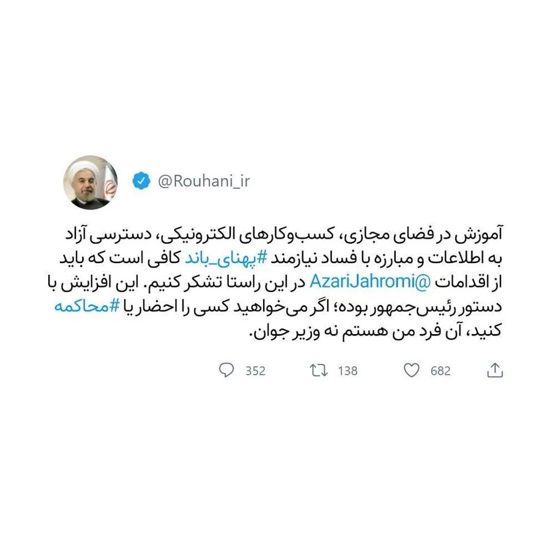 به گزارش ایرنا، حسن روحانی اظهار کرد که در شرایط کرونا فضای مجازی به فضای تنفس برای مردم تبدیل شده است. او توضیح داد: «در ماه هایی که ناچار بودیم به مردم بگوییم کسب و کار خود را تعطیل کنید، به بچه ها گفتیم مدرسه و دانشگاه نروید؛ اگر این فضای مجازی نبود، دانش آموزان و دانشجویان چه کار می کردند و چگونه درس می خواندند؟ مردم در این شرایط چگونه سرگرم می شدند؟»