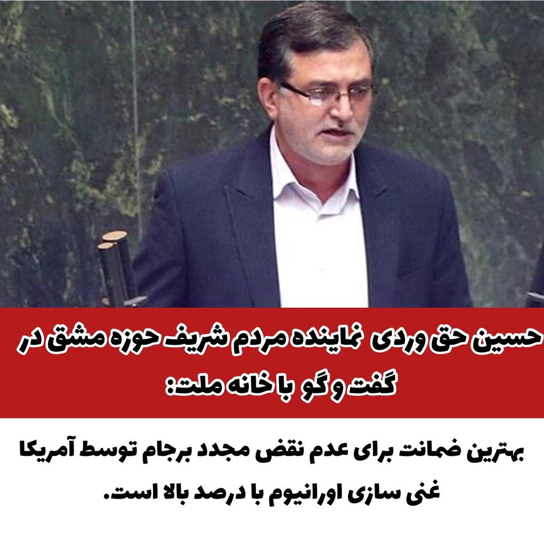 حسین حق وردی در گفت و گو با خبرنگار خبرگزاری خانه ملت درباره چگونگی اخذ ضمانت از آمریکا برای عدم تکرار نقض برجام، گفت: کلیات برجام طوری شکل گرفته که به هیچ وجه ما نمی توانیم از طرف مقابل ضمانت بگیریم. ایران تا کنون به تمامی تعهداتش عملیاتی کرده در حالی که غربیها منفعل عمل کردهاند لذا هرگونه ضمانتی توسط آمریکا و اروپا اجرایی نخواهد شد.