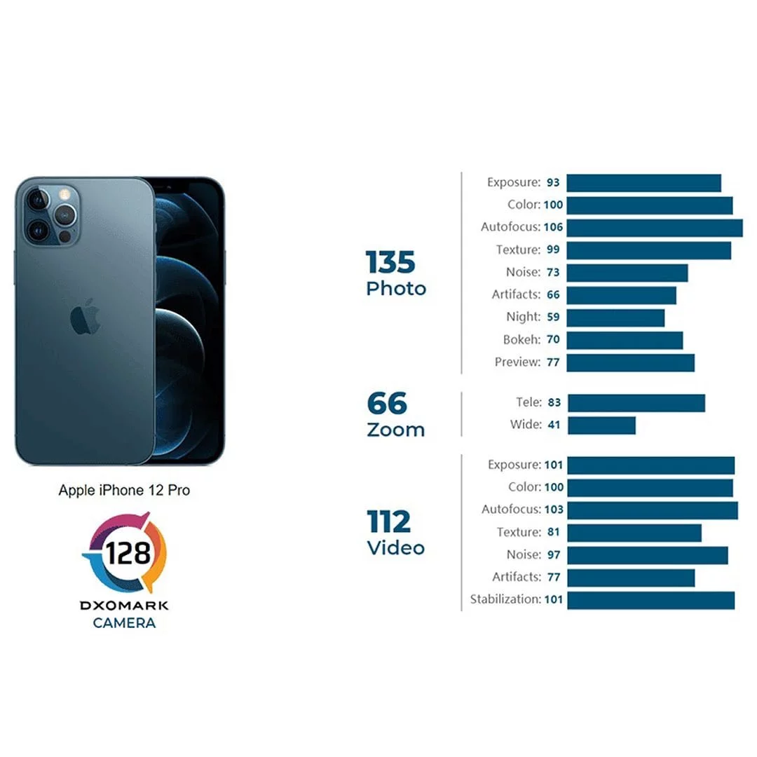 در این رتبه بندی آیفون ۱۲ پرو با کسب امتیاز ۱۲۸ در کنار شیائومی می ۱۰ پرو با ۱۲۸ قرار دارد. گوشی های هوشمند ویوو ایکس ۵۰ پرو پلاس با امتیاز ۱۲۷، اوپو فایند ایمس ۲ پرو با امتیاز ۱۲۶ و سامسونگ گلکسی S20 الترا ۵ جی نیز با امتیاز ۱۲۶ قرار گرفته اند.