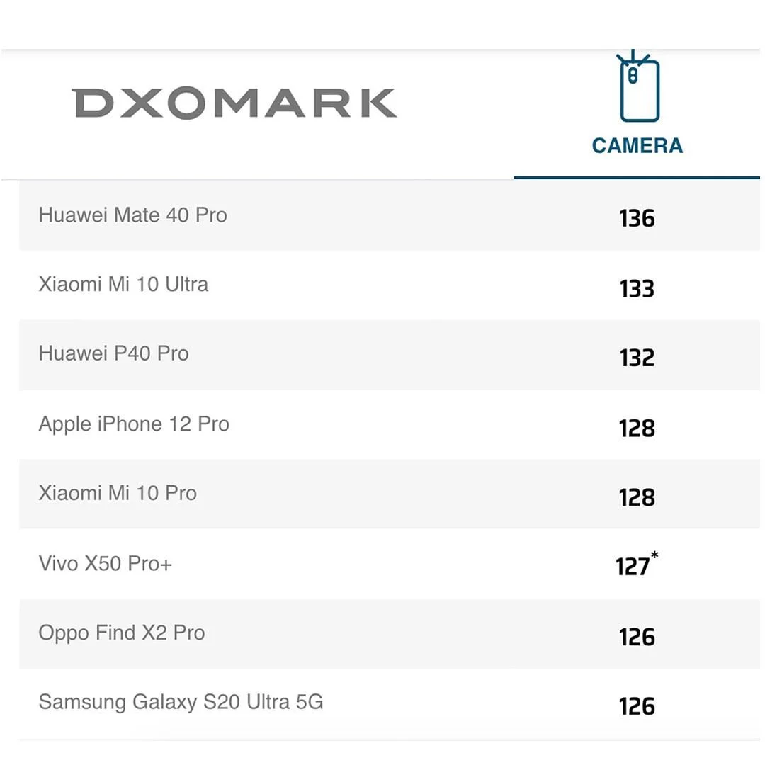 براساس جدول رتبه بندی در این وب سایت، هواوی میت ۴۰ پرو با کسب امتیاز ۱۳۶ صدرنشین، شیائومی می ۱۰ الترا با امتیاز ۱۳۳ در رتبه دوم، هواوی پی۴۰ پرو با امتیاز ۱۳۲ در جایگاه سوم قرار دارند.
