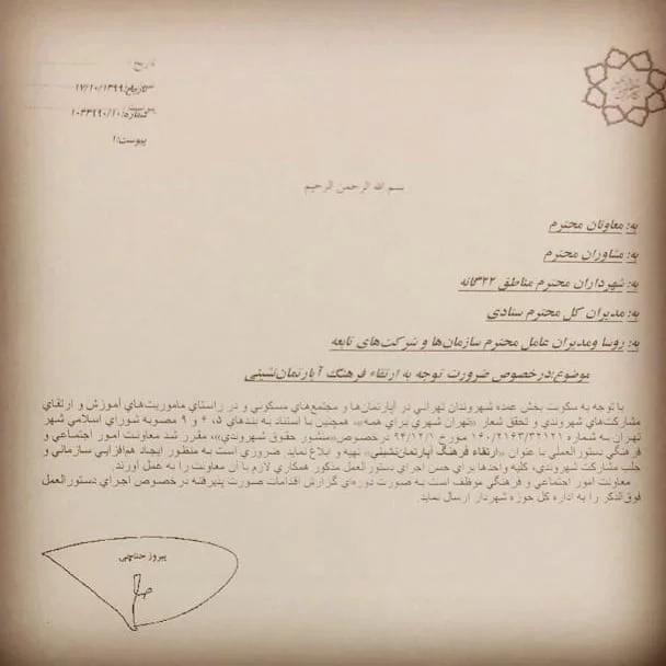 خبر خوب این که شهردار تهران با ابلاغ دستور اجرای کمپین «ارتقا فرهنگ آپارتمان نشینی» همه واحدهای شهرداری تهران رو ملزم به همکاری در جهت هم افزایی و مشارکت شهروندان در برگزاری این پویش کردن.